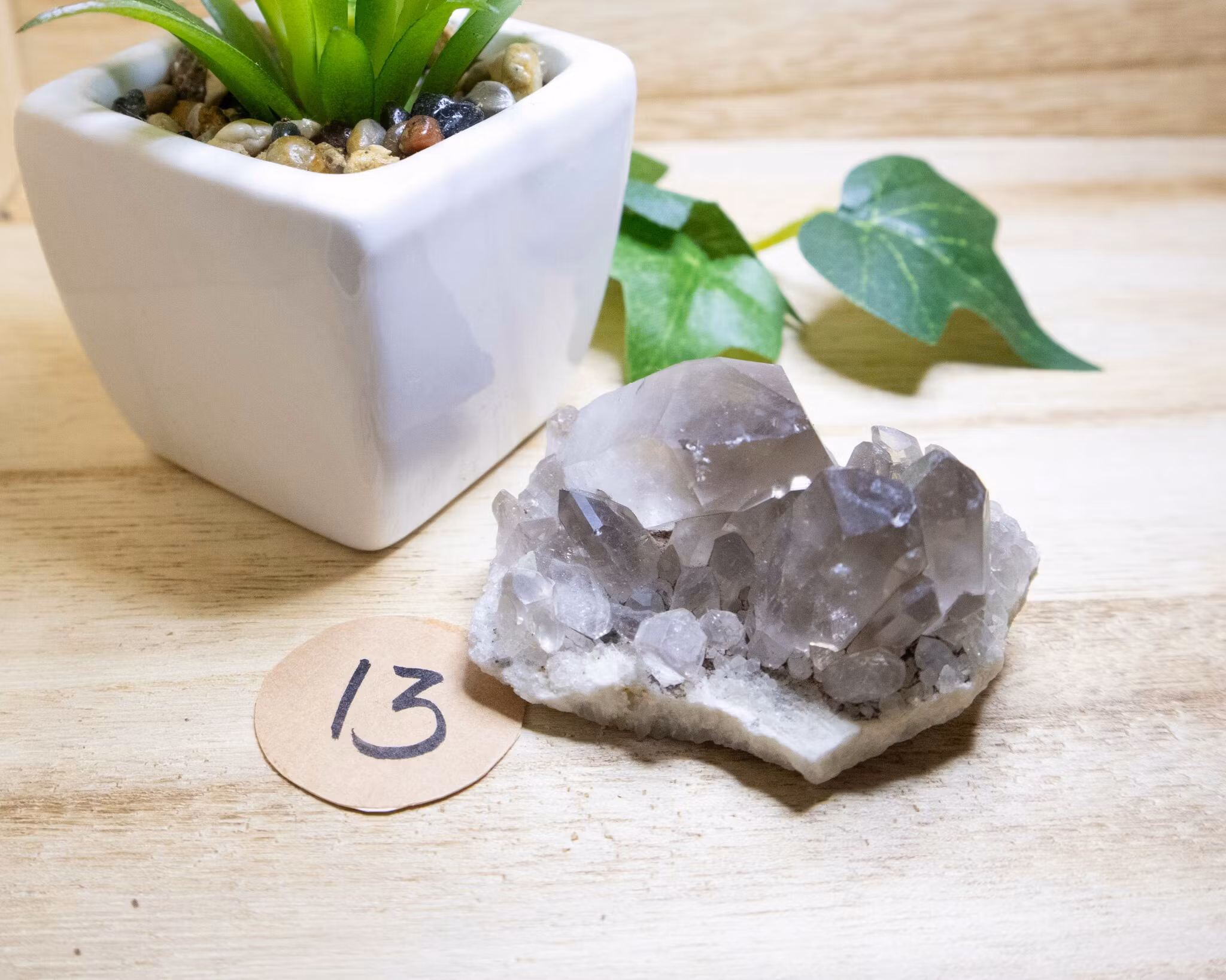 Härliga vackra rökkvartskluster i olika storlekar. Färgen varierar från ljus till mörk. Det finns med stora spetsar och små spetsar. Rökkvartsen får sin fä