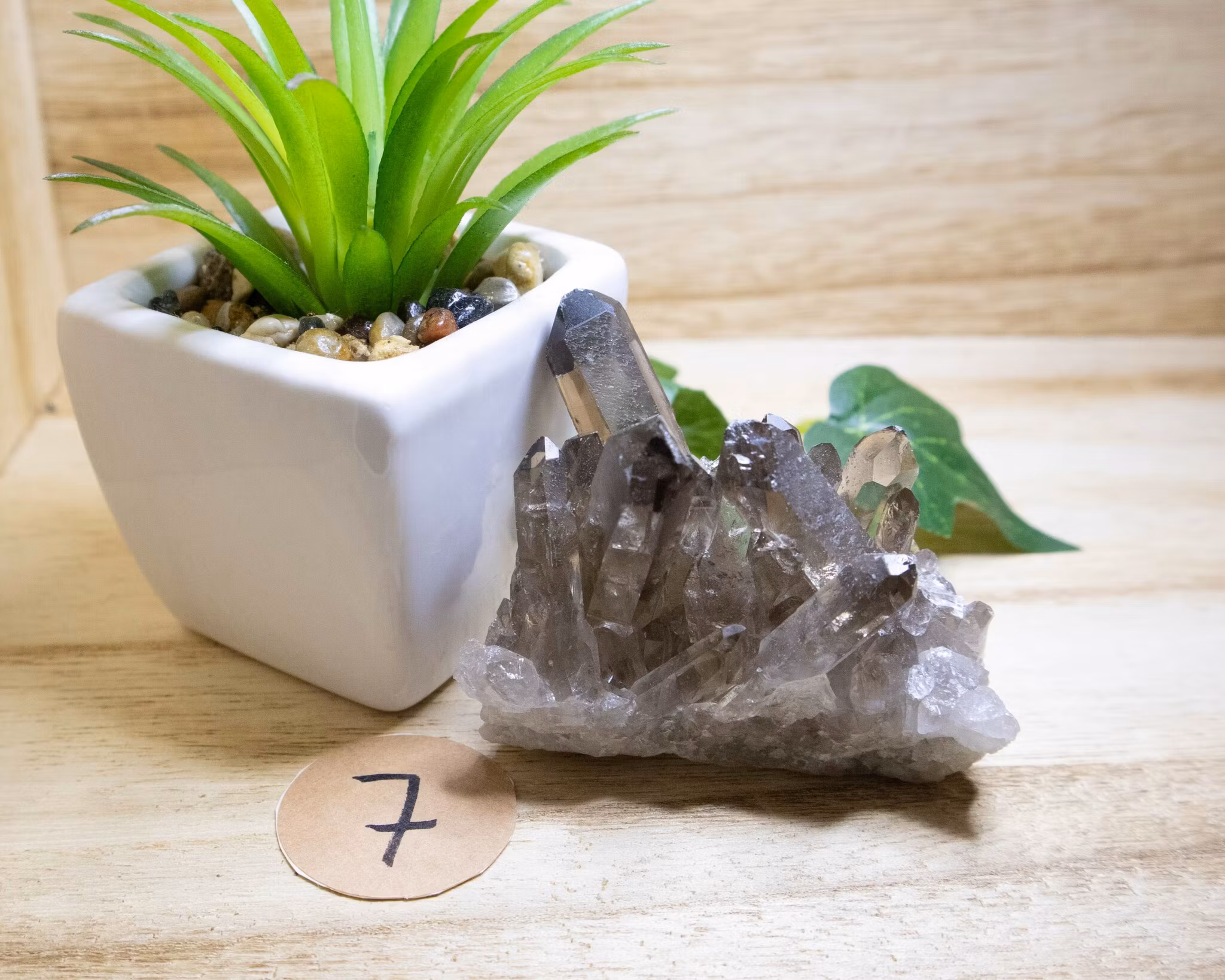 Härliga vackra rökkvartskluster i olika storlekar. Färgen varierar från ljus till mörk. Det finns med stora spetsar och små spetsar. Rökkvartsen får sin fä