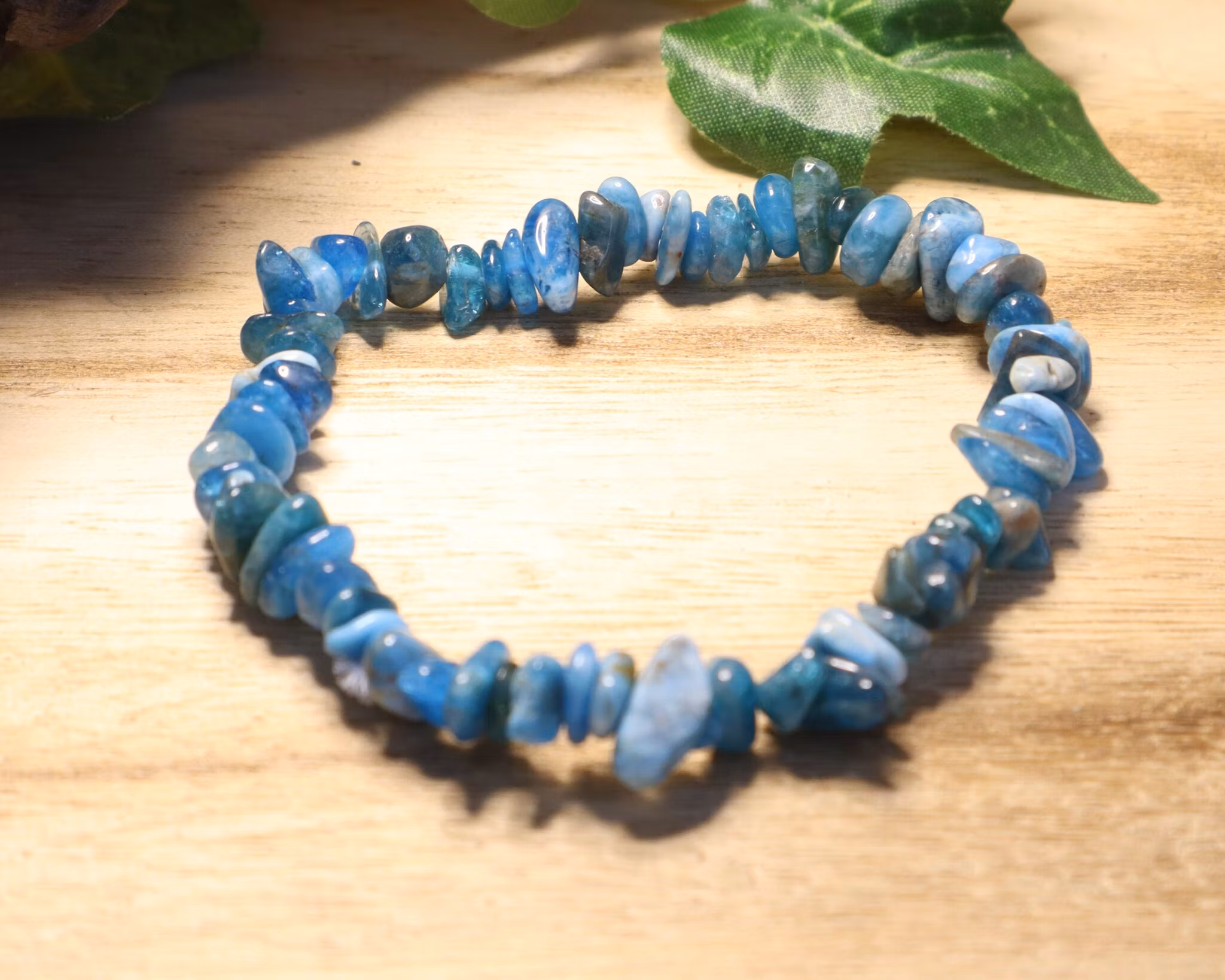En härligt blå sten som påminner om havet. Apatit tar bort blockeringar och balanserar, tillför energi. Hjälper dig förstärka och förverkliga dina idéer. En bra sten för uttryck, klarhet och för att se sanningar. Förbinder det förflutna med framtiden. Rensar bort förvirring genom att stimulera kreativitet.